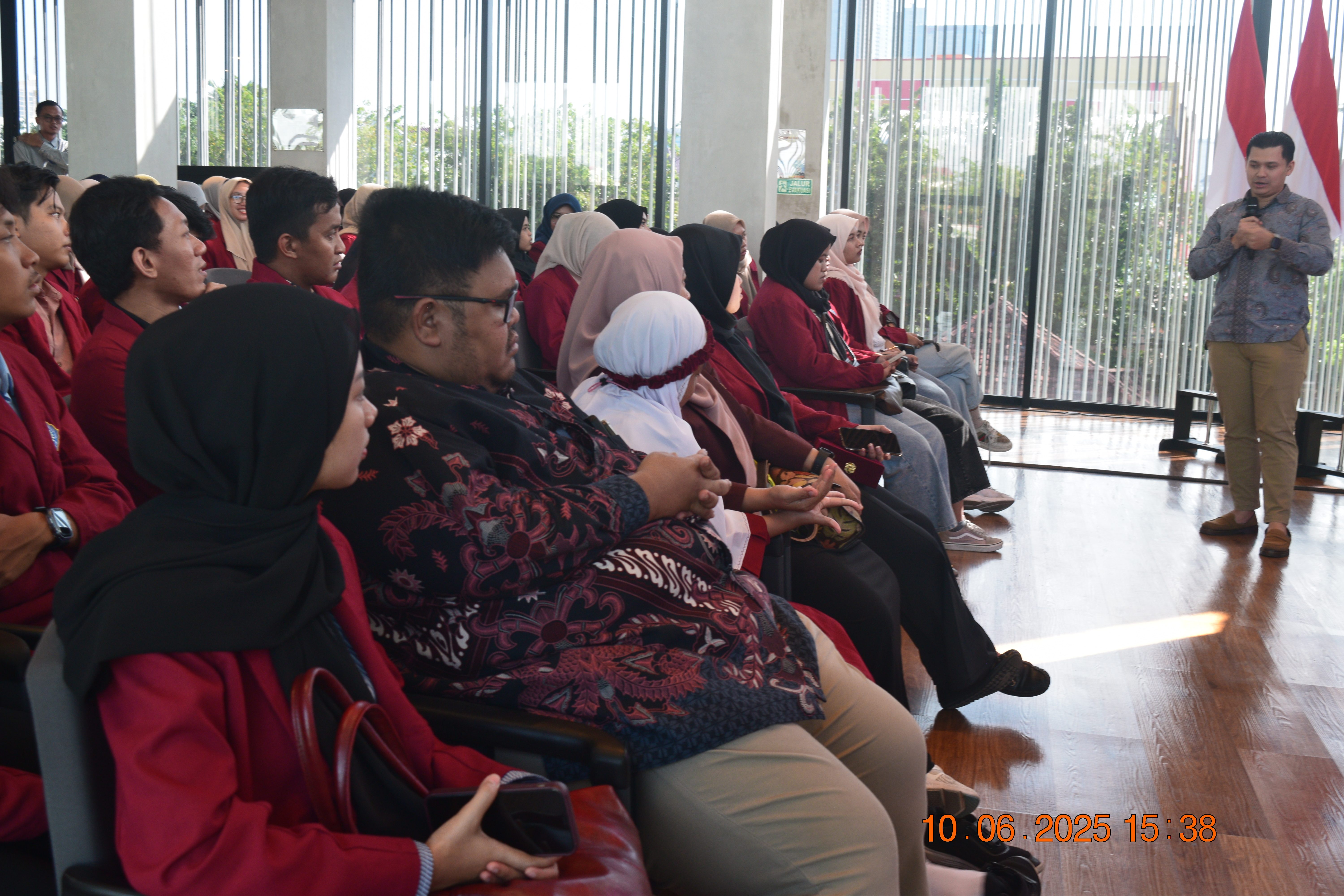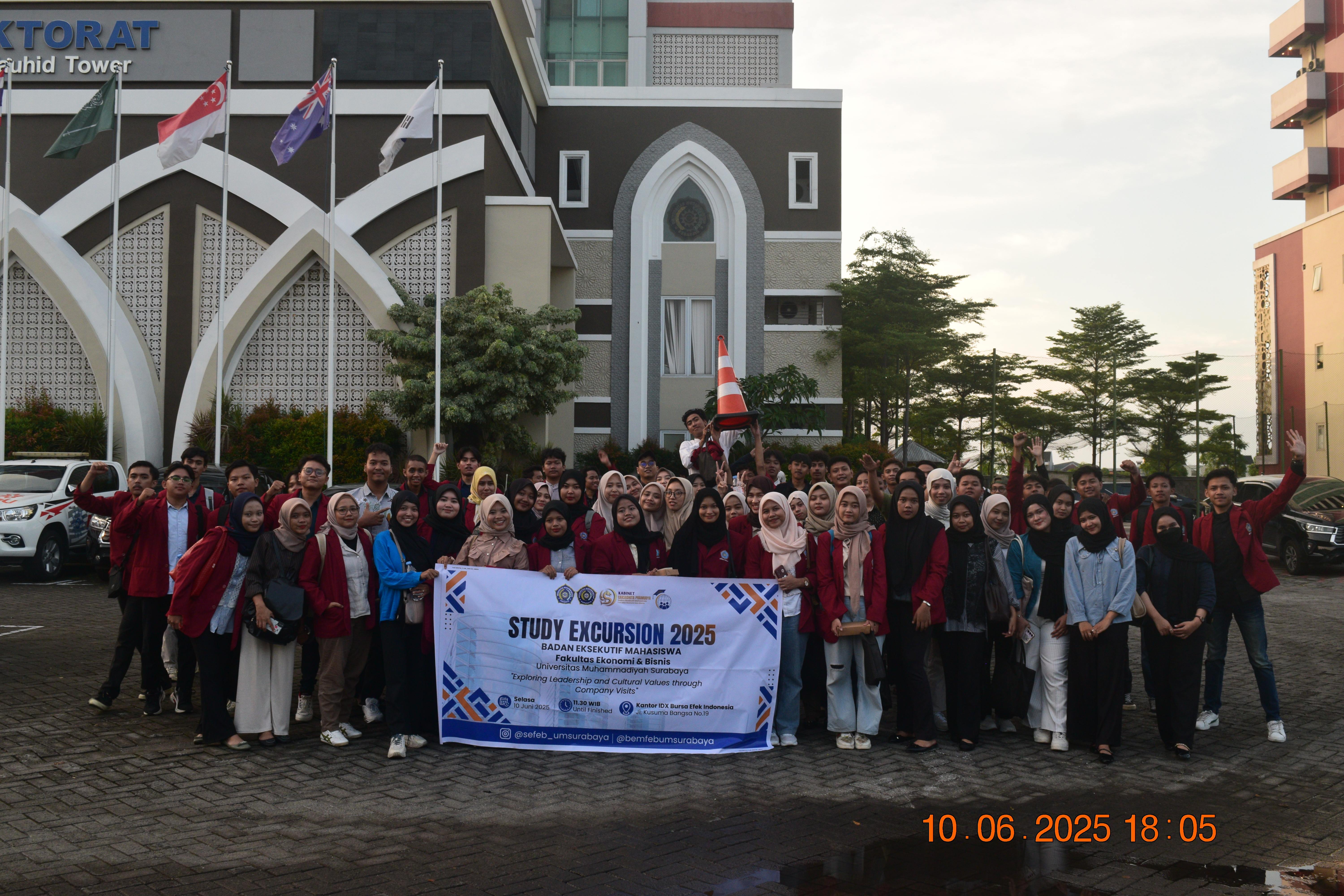 Surabaya(Rabu, 10/6/2025) - Badan Eksekutif Mahasiswa (BEM) Fakultas Ekonomi dan Bisnis Universitas Muhammadiyah Surabaya mengadakan kegiatan Study Excursion dengan tema "Mengeksplorasi kepemimpinan dan nilai budaya melalui kunjungan perusahaan". diikuti sebanyak 101 peserta dari mahasiswa reguler pagi dan sore dengan panitia dari BEM sebanyak 22 panitia, didampingi oleh dosen dari prodi akuntansi Adhar Putra, SE., M.Ak dan dosen prodi manajemen Anita Roosmawarni, SE., M.SE. dilaksanakan di kantor IDX Bursa Efek Indonesia Perwakilan Jawa Timur. Acara dimulai pada pukul 14.00 berakhir pukul 16.00 WIB
