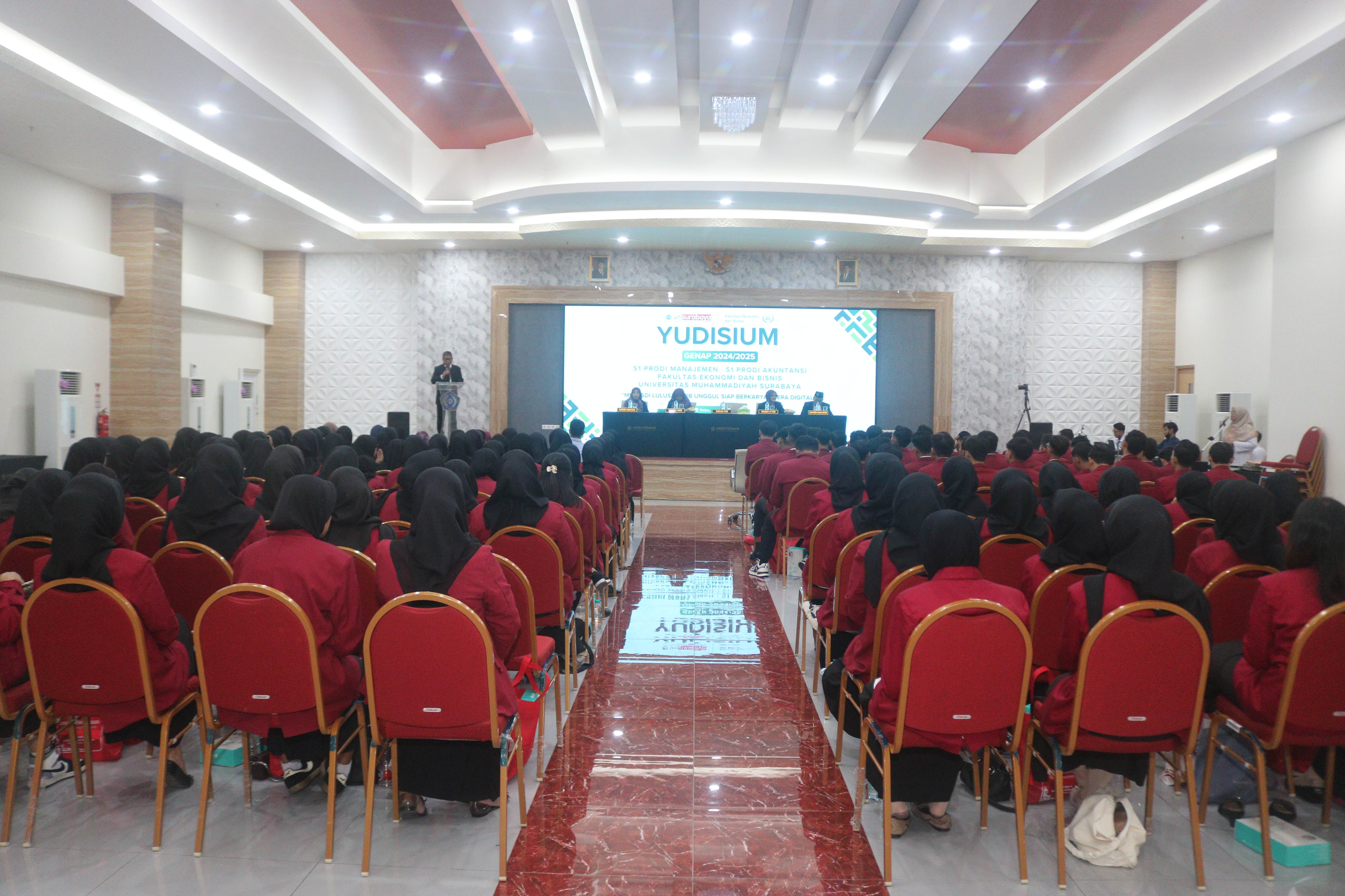 Fakultas Ekonomi dan Bisnis Universitas Muhammadiyah Surabaya telah melaksanakan acara yudisium bagi yudisiawan dan yudisiawati semester genap 2024-2025. acara dilaksanakan pada hari Rabu, 22 Oktober 2025, bertempat di Ruang Auditorium Gedung At-Taawun Lantai 23 UM Surabaya. dihadiri sebanyak 132 Yudisiawan dan yudisiawati yang sudah diresmikan untuk menyandang gelar sarjana Manajemen dan Sarjana Akuntansi.